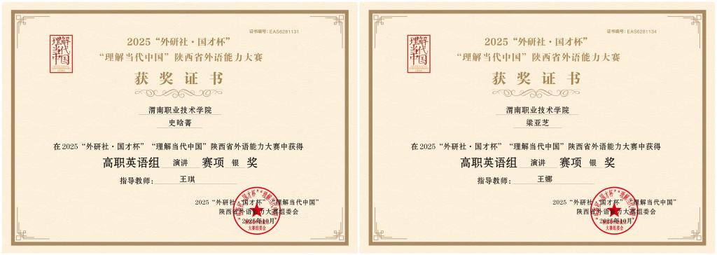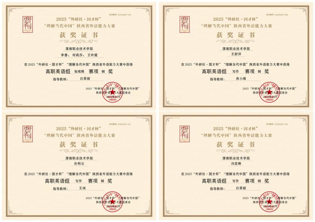 近日,陕西省教育厅公布了2025“外研社・国才杯”“ 理解当代中国”陕西省外语能力大赛获奖名单。我校学子在高职英语短视频、演讲、写作三个赛项中奋力拼搏,凭借扎实的语言功底与出色的综合表现,一举斩获 3 金 2 银 4 铜的战绩,在全省高职院校中排名前列,充分彰显了我校外语教学的丰硕成果和育人成效。